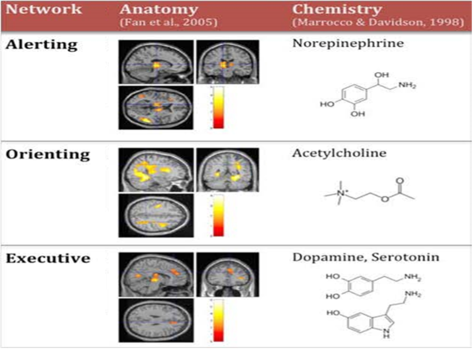 An important insight from neuroscience is that attention is not a unitary process. There are various models dividing attention in different components that interact between them (e.g.,4 ). In one popular model, three attentional networks have been identified as neuroanatomically distinct5,6. Each network involves different neural circuits and structures and different neurotransmitters are predominantly used within each network (Figure 1) 7. The performance in these three attentional networks can be measured 8 and also trained 9. Importantly, strong performance in one network is not necessarily correlated with strong performance in another network, consistent with the distinct nature of the three networks 8 . However, the three networks interact and work together to accomplish many tasks. Let’s look at these networks in more detail.