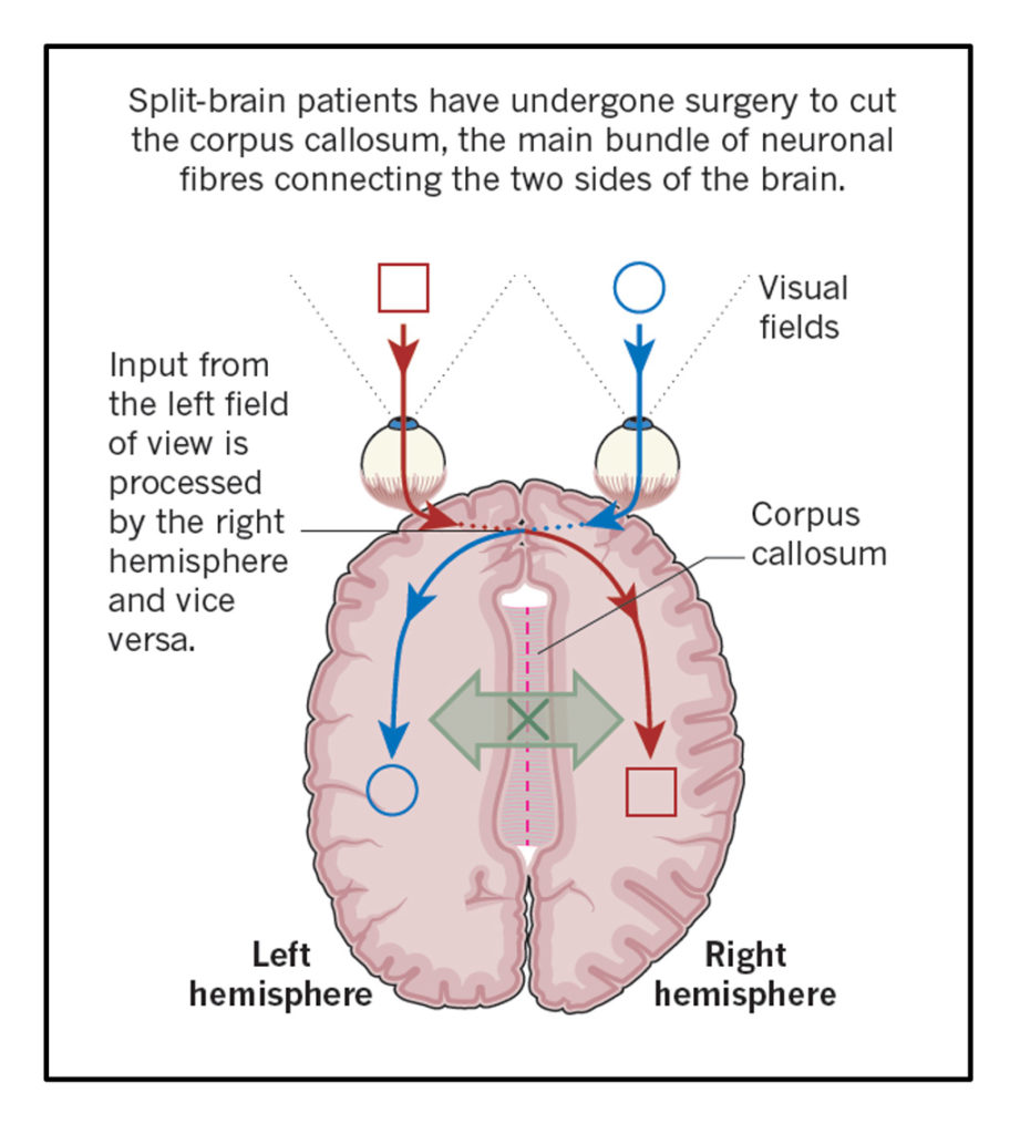 Figure 2. The crossover pattern such that information from the left visual field is processed by the right hemisphere (red pathway) and information from the right visual field is processed by the left hemisphere (blue pathway). The green X reminds us that the corpus callosum is severed in split-brain patients so that the hemispheres cannot share information. Reprinted by permission from RightsLink: Springer Nature from ref 3.