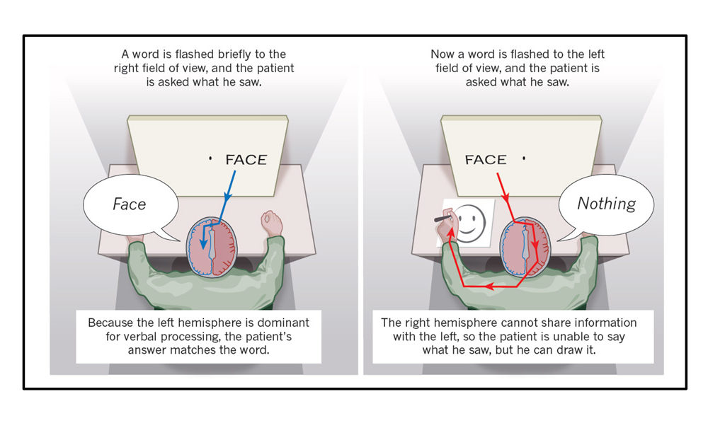 In classic experiments4-6, split-brain patients were seated in front of a screen. They were asked to keep their eyes on a black dot at the center of the screen. The dot marked the separation of the left visual field (on the left side of the screen) from the right visual field (on the right side). Next, a word appeared very briefly on one side of the screen. Then patients were asked to say what they saw. The set-up is illustrated in Figure 3. When the word appeared on the right side of the screen, the information was sent to the left hemisphere and the patients were able to say the word when asked what they had seen. But when the word appeared on the left side of the screen, the information was sent to the right hemisphere and the patients were not able to verbally report what they had seen. However, if given a pen and asked to draw what they had seen with their left hand (controlled by the right hemisphere, which had received the word information on the screen), they were able to draw the meaning of the word. The researchers had found that the left hemisphere in adults was specialized for speech and the right hemisphere could recognize words but not articulate them. You can see a video of this experiment with a split-brain patient here. Roger Sperry received the 1981 Nobel Prize in Physiology or Medicine for this fascinating research on hemispheric specialization and how the human brain functions.