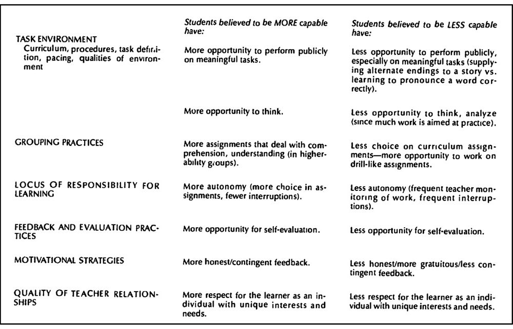 Table 1. Teachers communicate expectations by behaving differently towards students whom they believe to be more or less capable. Reprinted with permission from the Association for Supervision and Curriculum Development, Table 6.1, p. 72, in ref 39.