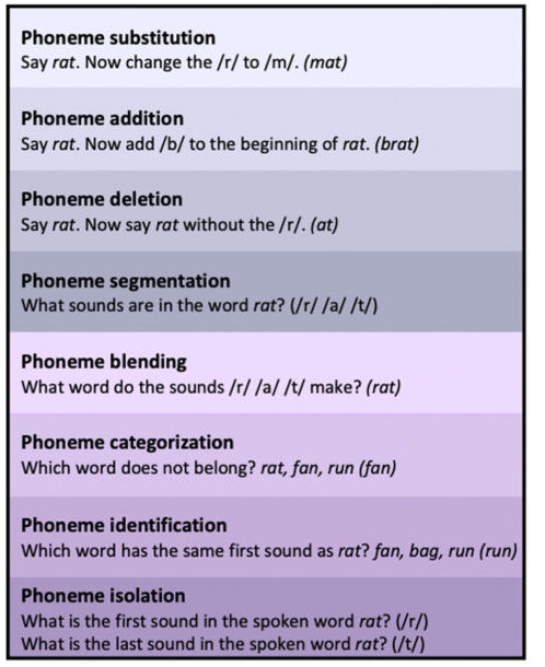 Figure 1. Some phonemic awareness tasks, with examples, from less difficult (bottom) to more difficult (top). Note that the most difficult task, phoneme substitution, relies on many of the other skills. Also recall that phonemic awareness involves sound processing, so no print is involved in these tasks – only spoken words and sounds.