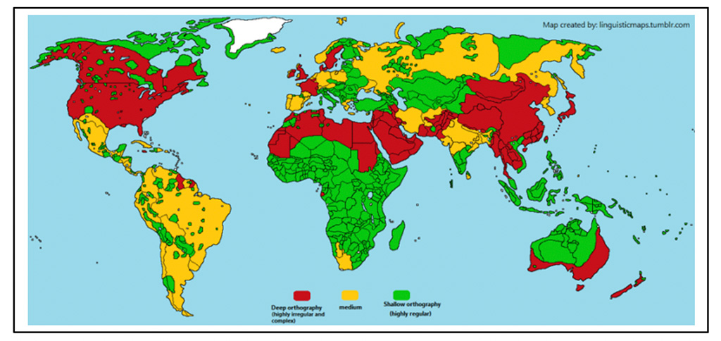 Figure 4. Orthographic depth, plotted as three levels although a spectrum in reality, for languages across the globe. Attribution: R. Pereira, https://linguisticmaps.tumblr.com/post/187856489343/orthographic-depth-languages-have-different-levels