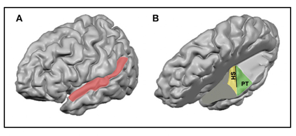 Figure 5. (A) A left hemisphere view of the human brain with the superior temporal region shaded pink. (B) An internal view from the top of the left temporal lobe with parietal areas removed to reveal Heschl’s sulcus (HS) and the planum temporale (PT). Modified from Michelle Moerel, Federico De Martino, and Elia Formisano, 2014, Wikimedia Commons, CC-BY 3.0
