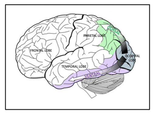Figure 6. The ventral (purple shading) and dorsal (green shading) visual processing streams (labels added). Selket/Wikimedia Commons, GNU Free Documentation License, CC BY-SA 3.0
