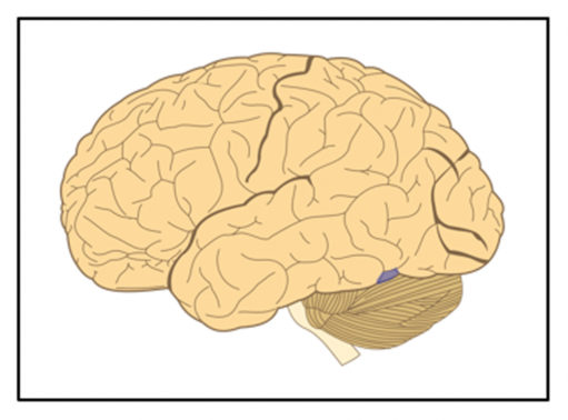Figure 7. A left hemisphere view of the human brain with the approximate location of the visual word form area shaded purple. Modified from Hugh Geiney (shading added) on Wikimedia Commons, CC BY-SA