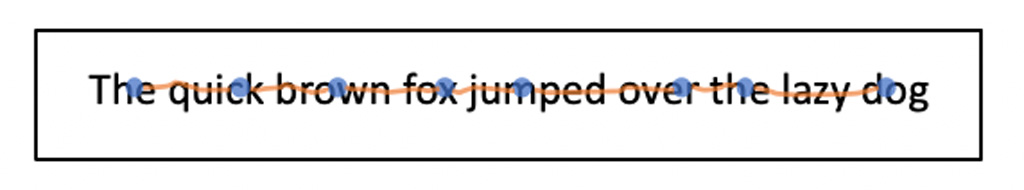 Figure 8. A cartoon of a sentence read with fixations (blue dots, when the eyes are briefly stopped) and saccades (orange lines, when the eyes are moving across the text) marked. For skilled readers, fixations last about 200-250 milliseconds and average saccade length is 7 to 9 letter spaces. For beginning readers, fixations can last over 300 milliseconds and average saccade length is much shorter, sometimes only 1 or 2 letter spaces. Fixation and saccade length also depend on the familiarity and complexity of the text.