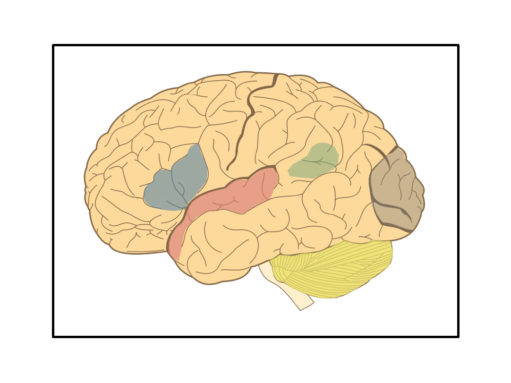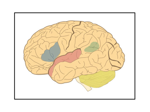 Figure 4. A left hemisphere view of the human brain with the superior temporal lobe (pink), angular gyrus (green), Broca’s area/inferior frontal gyrus (blue), cerebellum (yellow), and visual cortex/occipital lobe (gray) regions shaded. Modified from Hugh Geiney (shading colors added) on Wikimedia Commons under CC-BY-SA