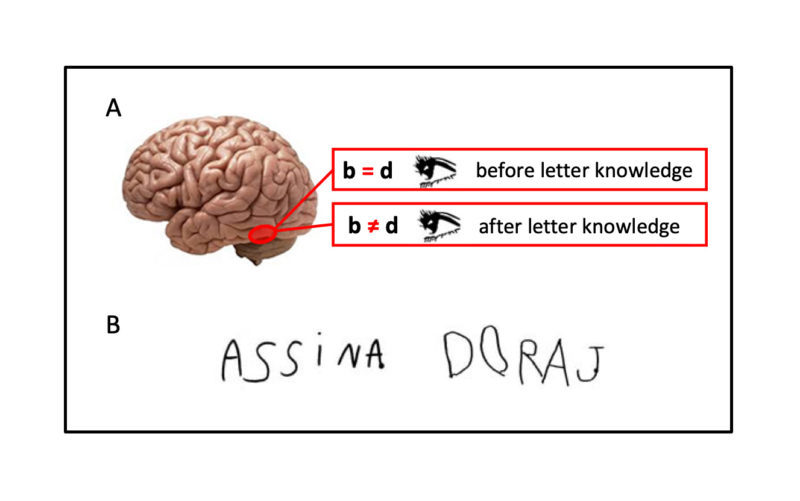 Also in terms of visual perceptual processing, children must learn that orientation matters for letters. For most objects in a child’s life, a change in orientation does not change the identity of the object. For example, a teacup set right-side-up and the teacup set upside-down are both the same teacup. But, for letters, a right-side-up lowercase b and an upside-down lowercase b are not the same thing: one is a b and the other is a p. Similarly, a teacup flipped to the left or flipped to the right is still the teacup; we easily recognize the mirror image of an object as the object (this is called mirror invariance). But a lowercase b flipped to the left becomes something else: a lowercase d. As part of alphabet knowledge, children must learn that letters are a special case in which mirroring can create a new object. Indeed, learning to read involves a loss of mirror invariance processinge.g., 83,84. This is reflected in the brain’s visual system, in a region called the visual word form area (see Figure 6A)85-87. The loss of mirror invariance begins to emerge in the preschool years with growing letter knowledge88. This may be related to the prevalence of mirror writing in prereading children as part of typical development89,90 (see Figure 6B).