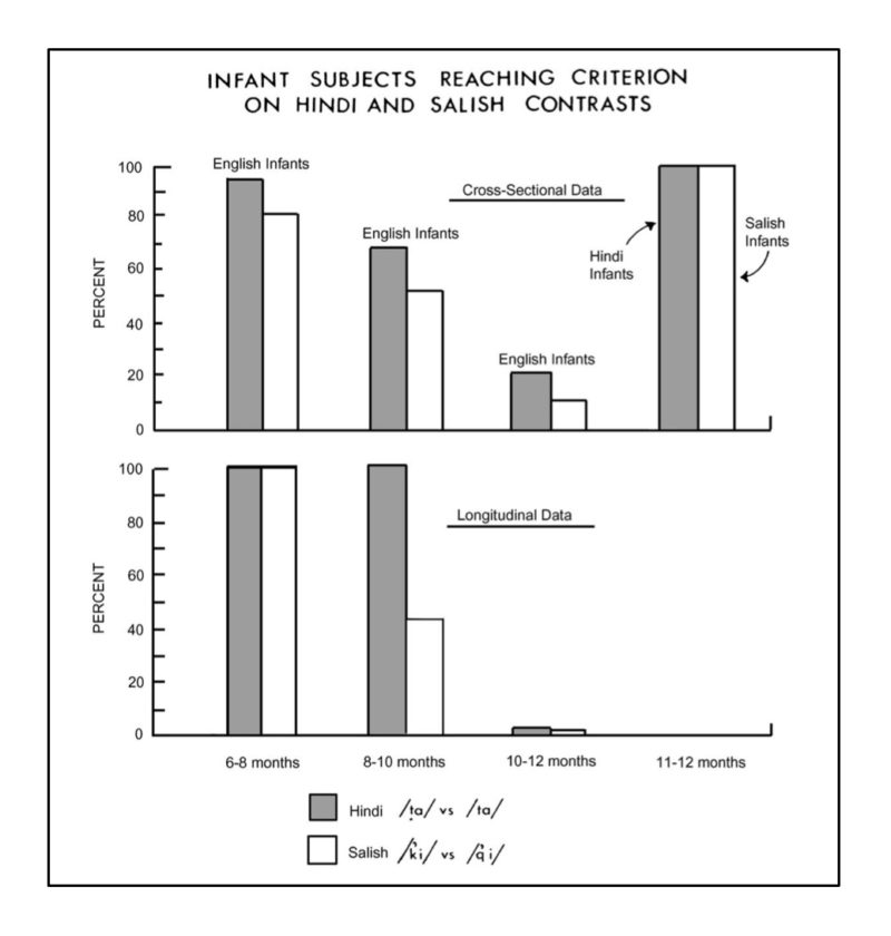 Figure 3. The proportion of infant research participants from three ages and various backgrounds reaching criterion on Hindi and Salish phoneme contrasts. At 6-8 months old, infants growing up in English-speaking households can distinguish the phonemes in the other languages. But by 10-12 months old, infants growing up in English-speaking households can no longer discriminate between phonemes in a non-native language. Reprinted from ref 51: Infant Behavior & Development, Vol. 25, J.F. Werker and R.C. Tees, Cross-language speech perception: evidence for perceptual reorganization during the first year of life, Figure 4, p. 131, 2002, with permission from Elsevier. https://www.sciencedirect.com/journal/infant-behavior-and-development