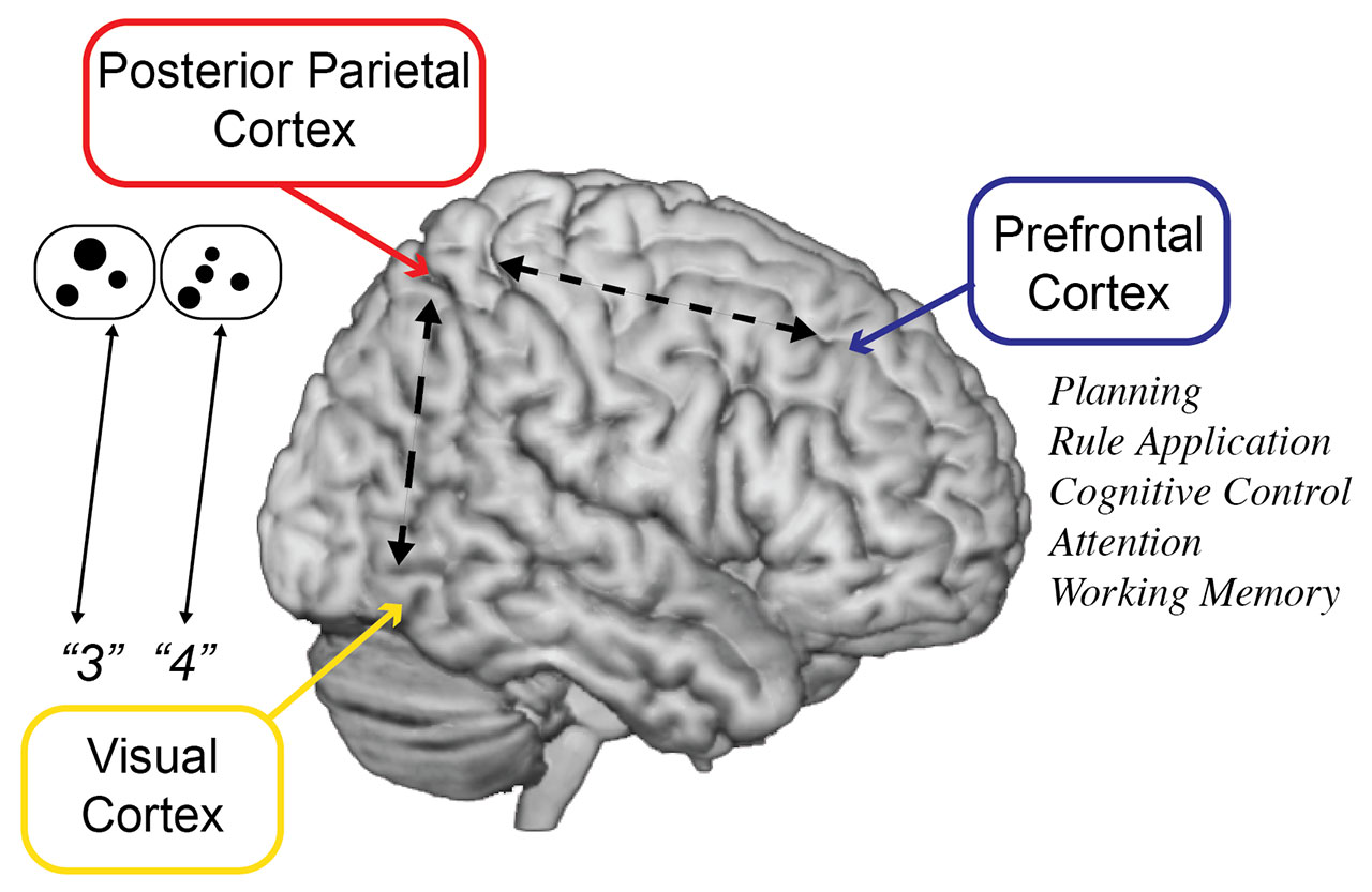 Numerosity refers to the (potentially) countable aspect of a given quantity. I say potentially because, in the case of a large set of items, its numerosity usually gets approximated rather than exactly counted—unless specifically required by the task. Numerosity manipulation is one of the processes at the core of successful math-knowledge acquisition8–10, and there is converging evidence to suggest that this ability is hosted by the posterior parietal cortex (see Figure 1). Critically, it has been shown that, together with difficulties in dealing with numerosities and reasoning about them (e.g., being able to correctly compare the numerosities of sets)11, children with DD display deficits at the level of the posterior parietal cortex. Specifically, when children with DD were asked to decide which of two sets of items was greater in numerosity while their brain activity was monitored via functional magnetic resonance imaging (fMRI) scanning, they showed less variation in the strength of their brain signal compared to a group of typically developing peers. These effects were mainly evident in the posterior parietal cortex12.