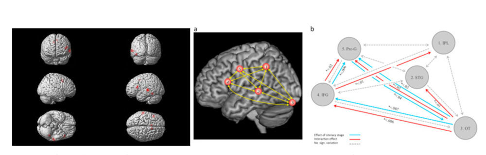 Figure 6. Left panel. Shows an fMRI image obtained during a reading task. Brain responses for letter strings and words were compared during the process of learning an additional language. Coloured areas show that reading particularly engages a set of (predominantly) left-hemisphere lateralised areas in the inferior frontal gyrus, temporo-parietal cortex and inferior temporal cortex which are also functionally linked to the component reading skills of semantic, phonological and orthographic processing. Middle and right panels (a, b). Describing functional connectivity within key hubs of the reading network (a. areas labelled 2,3,4 correspond with those identified in the left panel) including, b. a graph of the changes in functional connectivity during reading skill acquisition and their directional effects associated with different trajectories of reading acquisition (coloured arrows). Note here the change of emphasis from that of localised activity (left panel) to describing functional connectivity patterns between hubs in a network of brain areas engaged in a task (right panels). Images from reference [21] are available by permission through CreativeCommons license (CC BY-NC-ND 4.0)