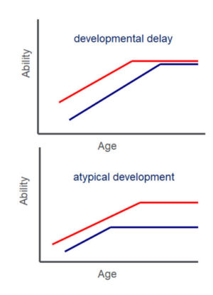 Figure 5. Hypothetical developmental trajectories, describing changes in an outcome measure of interest (labelled here’ ability’) and across age. Red lines represent the normative developmental trajectory of ability; blue lines represent the trajectory of a single individual. The developmental delay trajectory is characterised by a rightward shift in the individual measure of ability towards later ages, the result being that normative ability is achieved by the individual but at an age later than is typical for the normative group. The atypical development trajectory represents a pattern of ability in which normative performance is not attained by the individual at any point (age) across development.