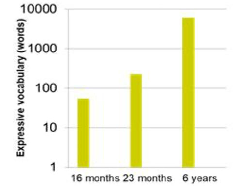 Figure 3. Estimates of the gains in expressive vocabulary in young childhood (see for e.g., refs [6,7]). The rapid development in children’s vocabulary learning in early childhood parallels the changes in functional connectivity in the brain.