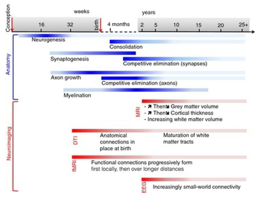 Figure 2. The sequence of key neurodevelopmental events in the maturation of human brain structure (blue bars). Each bar represents the typical timeframe over which a particular process is active, with darker shading marking time periods of peak changes. Red bars indicate anatomical observations of these phenomena, as visualised with different neuroimaging paradigms: fMRI, functional Magnetic Resonance imaging; DTI: Diffusion tensor imaging; EEG: electroencephalography. The mechanisms that directly underlie the establishment of neural connectivity in the developing brain are particularly active in the early to mid-childhood and parallel the particularly steep gains in learning potential observed for children during this time period. Image from reference [4] available by permission through Creative Commons license (CC BY 3.0).