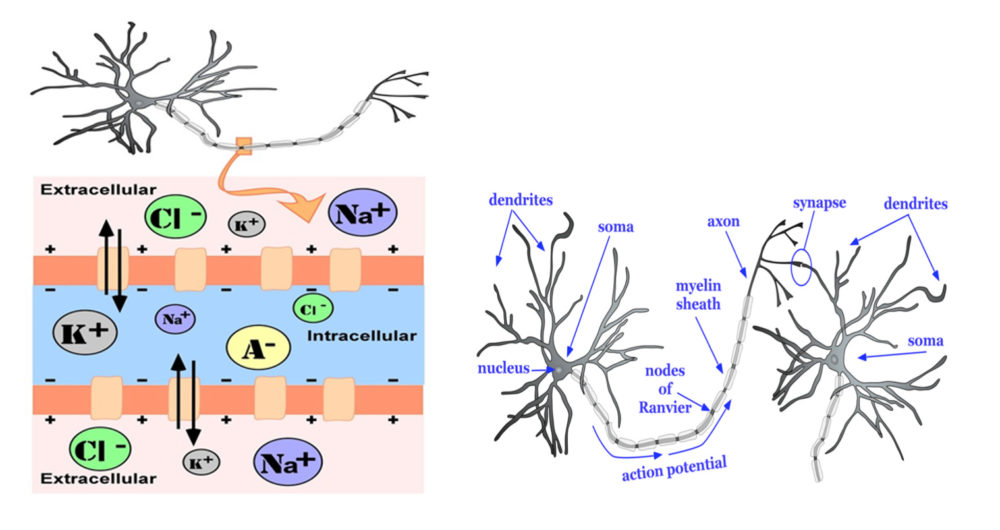 Figure 1. Left panel. Cross section of a prototypical membrane of a neuron. The intracellular environment with high potassium (K+) and organic anions (A-) is actively maintained by a sodium/potassium (NA+) pump (bidirectional arrows) which facilitates ion exchange across the cell membrane. This ion exchange results in a small negative charge that is maintained across the membrane as its default (resting) state. Right panel. A simple neural network comprising two prototypical neurons, highlighting four main structural features that characterise all nerve cells: a cell body, or soma; an axon terminating at synapses between the pre-synaptic (left) and post-synaptic (right) cells, and a set of dendrites for receiving incoming signals. Illustrations from reference [3] and made available through Creative Commons license (CC by 4.0).