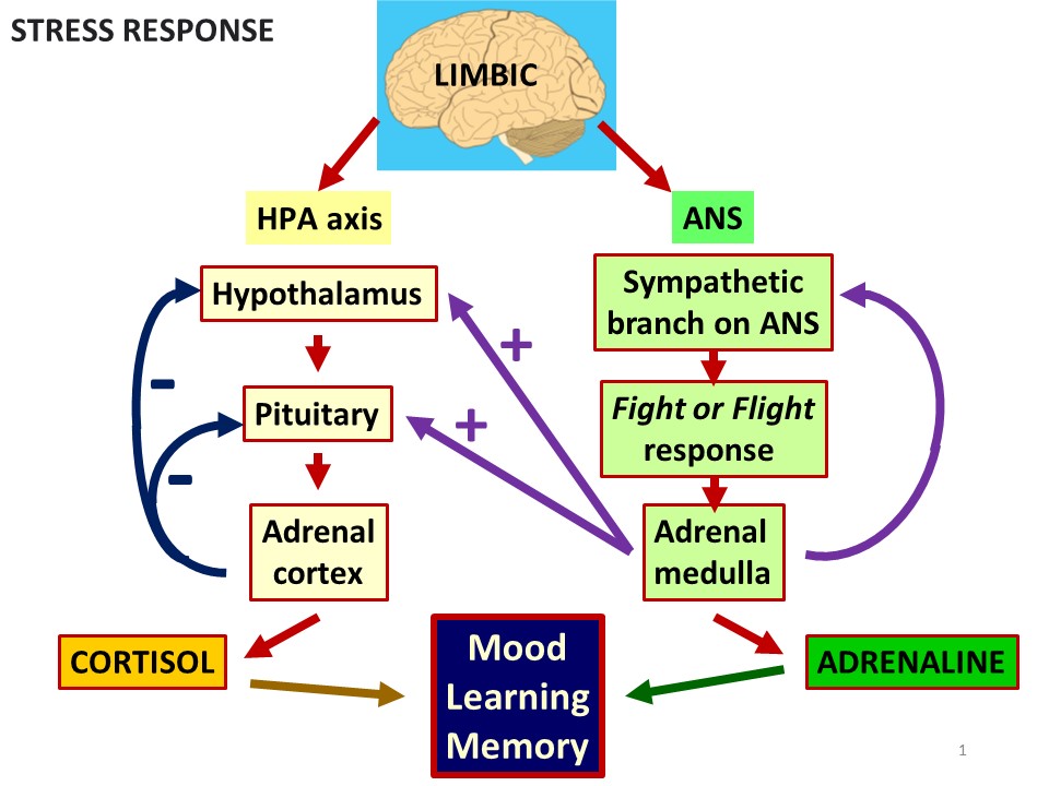 The stress response is very complex, with numerous mediators involved. Briefly, two major stress systems appear to be critical for the modulation of learning and memory processes. These are the rapid autonomic nervous system and the slower hypothalamus-pituitary-adrenal axis17 (see Figure 1). Within seconds of a stressful stimulus, the autonomic nervous system is activated, leading to the release of catecholamine neurotransmitters such as noradrenaline, from both the adrenal medulla and the locus coeruleus in the brain. Catecholamines prepare the body for “fight-or-flight” responses and rapidly affect neural functioning in several brain regions critical for learning and memory, such as the hippocampus, amygdala, and prefrontal cortex. A second system is also activated in response to stress, the hypothalamus-pituitary-adrenal axis, about 10 seconds later than the autonomic nervous system, resulting in the release of corticosteroids such as cortisol from the adrenal cortex. Cortisol can enhance or impair memory function, depending largely on how much time passed between the stressful event and the memory process. In this regard, it is known that moderate release of corticosteroids may enhance memory consolidation when close to the time of the event, but conversely they may impair memory consolidation if they are released a while before or after the event. Interestingly, another group of corticosteroids known as glucocorticoids may induce atrophy of the hippocampus, especially when chronic stress conditions turn acute, impairing long-term memory storage. Moreover, the physiological impact of repeated or prolonged chronic stress, called allostatic load, may cause exhaustion and breakdown18.